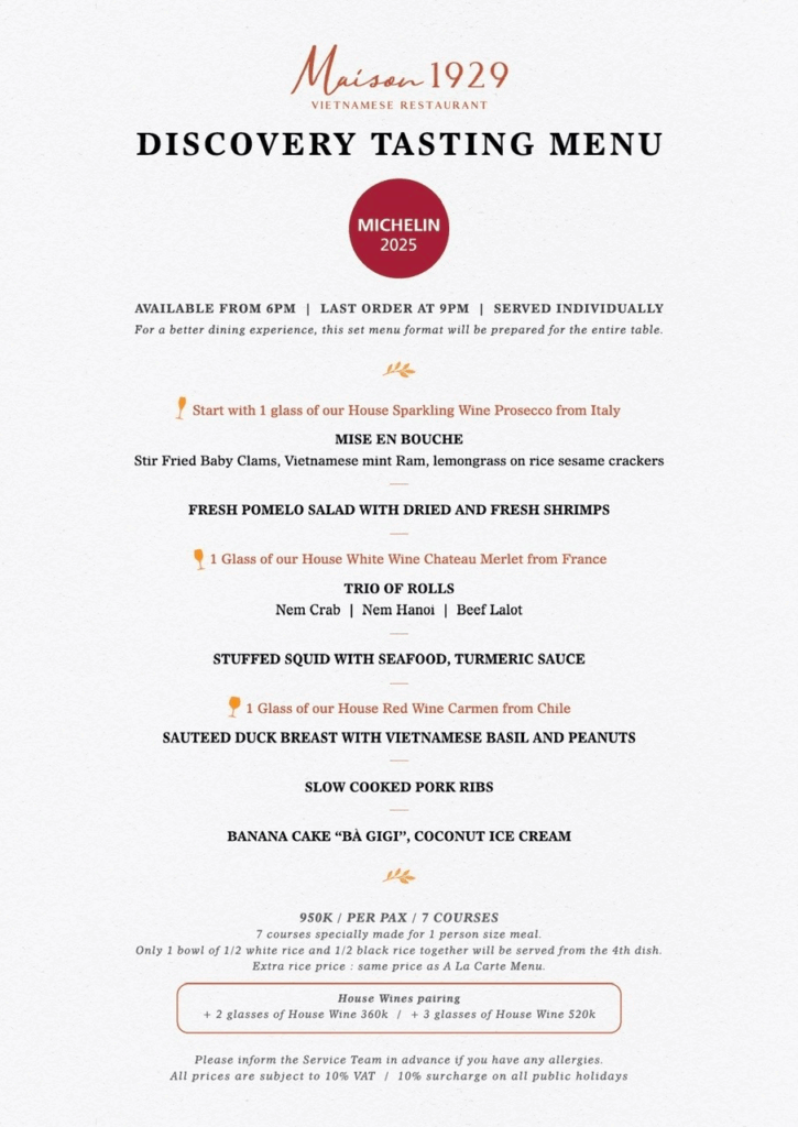 After being recognized as Michelin Selected in 2024, our head chef, Vincent Cao Minh Page, gently put together something very close to our heart: the Maison 1929 Michelin Tasting Menu.